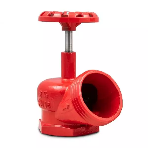 A válvula para hidrante 45º PN16 feita em ferro fundido atende todos os requisitos necessários para as válvulas de hidrante, tendo como benefício o baixo custo devido ao seu material de fabricação. válvula possui uma saída roscada para o acoplamento de um adaptador para mangueiras de combate a incêndios ou para um tampão de proteção.